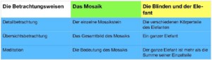 Am Schluss kommt es dann mit grosser Wahrscheinlichkeit zu einem interessanten Austausch der blinden Menschen über die doch recht ähnlichen, ganzheitlichen Erfahrungen mit dem Tier Elefant. So können die Blinden dieses Tier ganzheitlich in seiner ganzen Grösse, Würde, Sanftheit, Fürsorglichkeit und in seiner kulturellen Bedeutung erfahren. Niemandem würde es dann noch in den Sinn kommen sich ausschliesslich über die Formen der Einzelteile zu unterhalten, obwohl es sicherlich unter den Tieren – den asiatischen oder afrikanischen Elefanten – z.B. verschiede Formen und Grössen von Elefantenohren gibt …